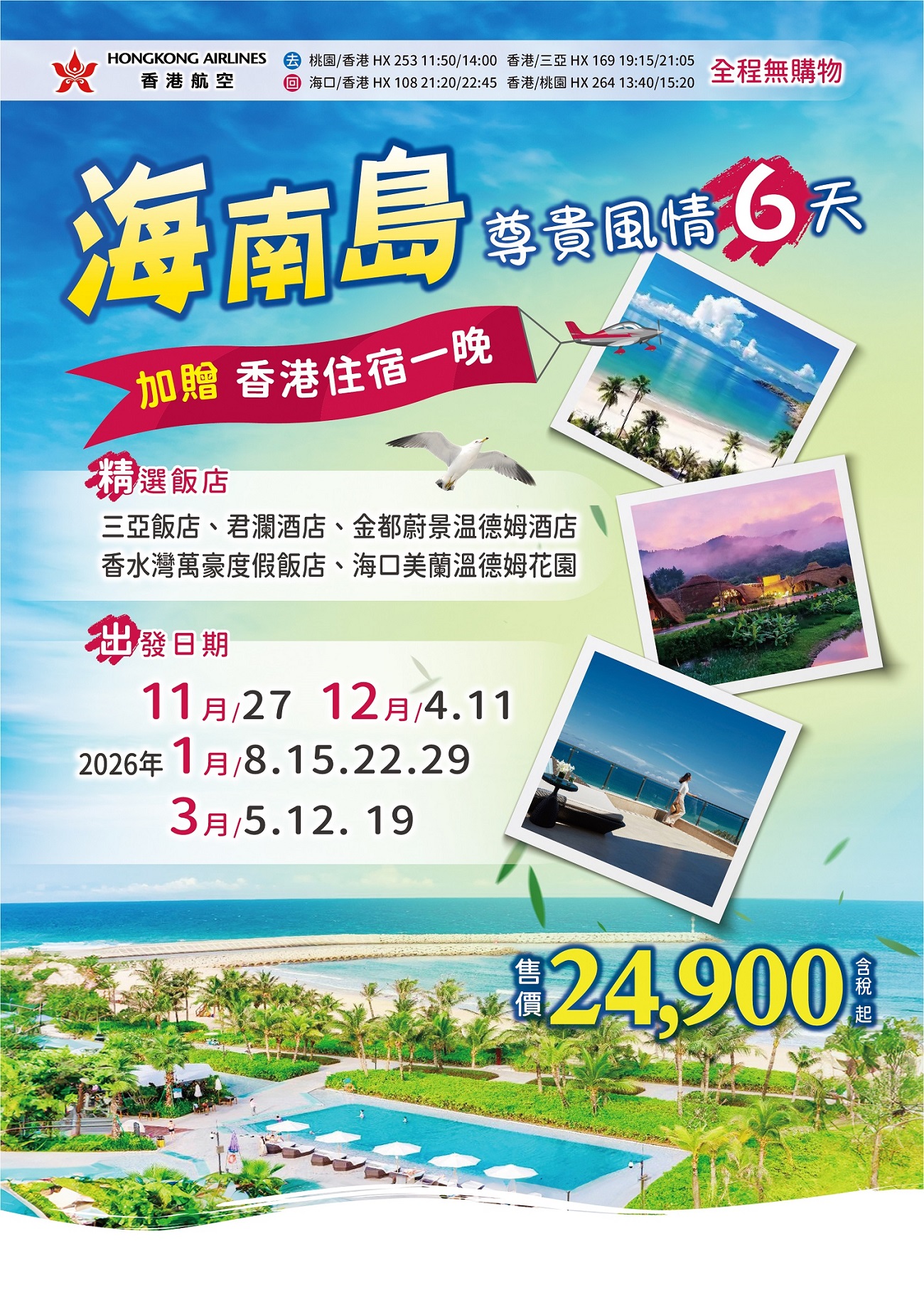 【香港航空】海南島~三亞.香水灣.海口+香港 尊貴風情6日~玫瑰谷.天崖海角.鹿回頭山頂公園.巴厘村(全程無購物)