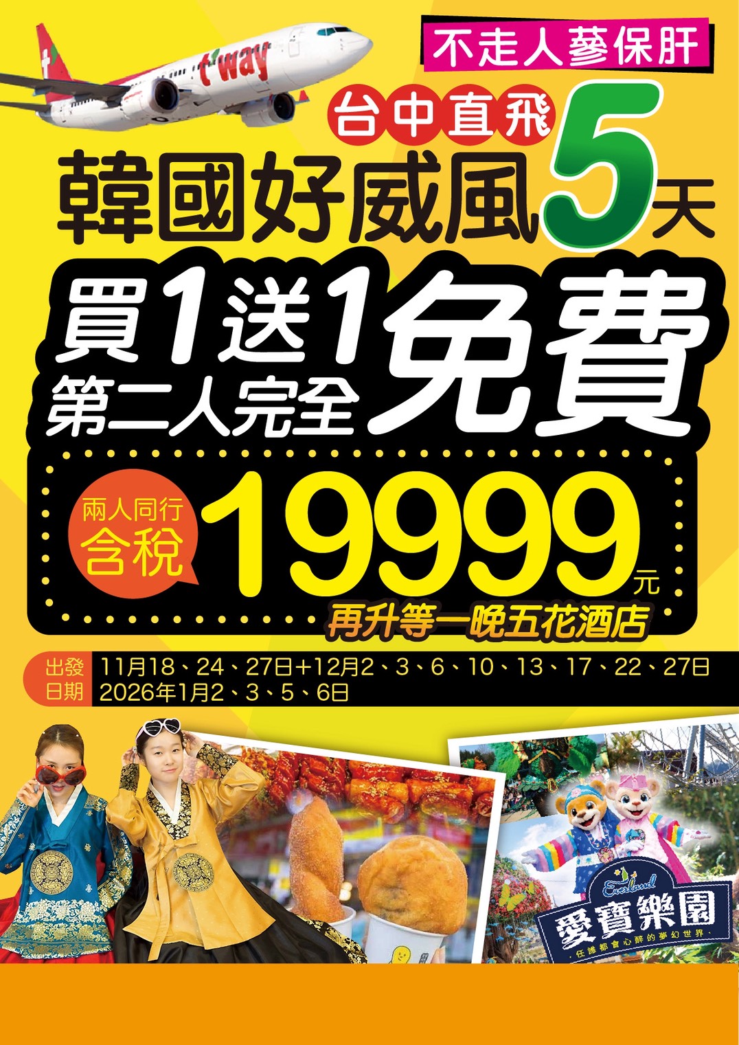 【德威航空、台中出發】鍾情韓國好威風5日《買一送一專案價》~愛寶樂園、首爾明洞、水原星空圖書館、水果大福DIY+韓服體驗