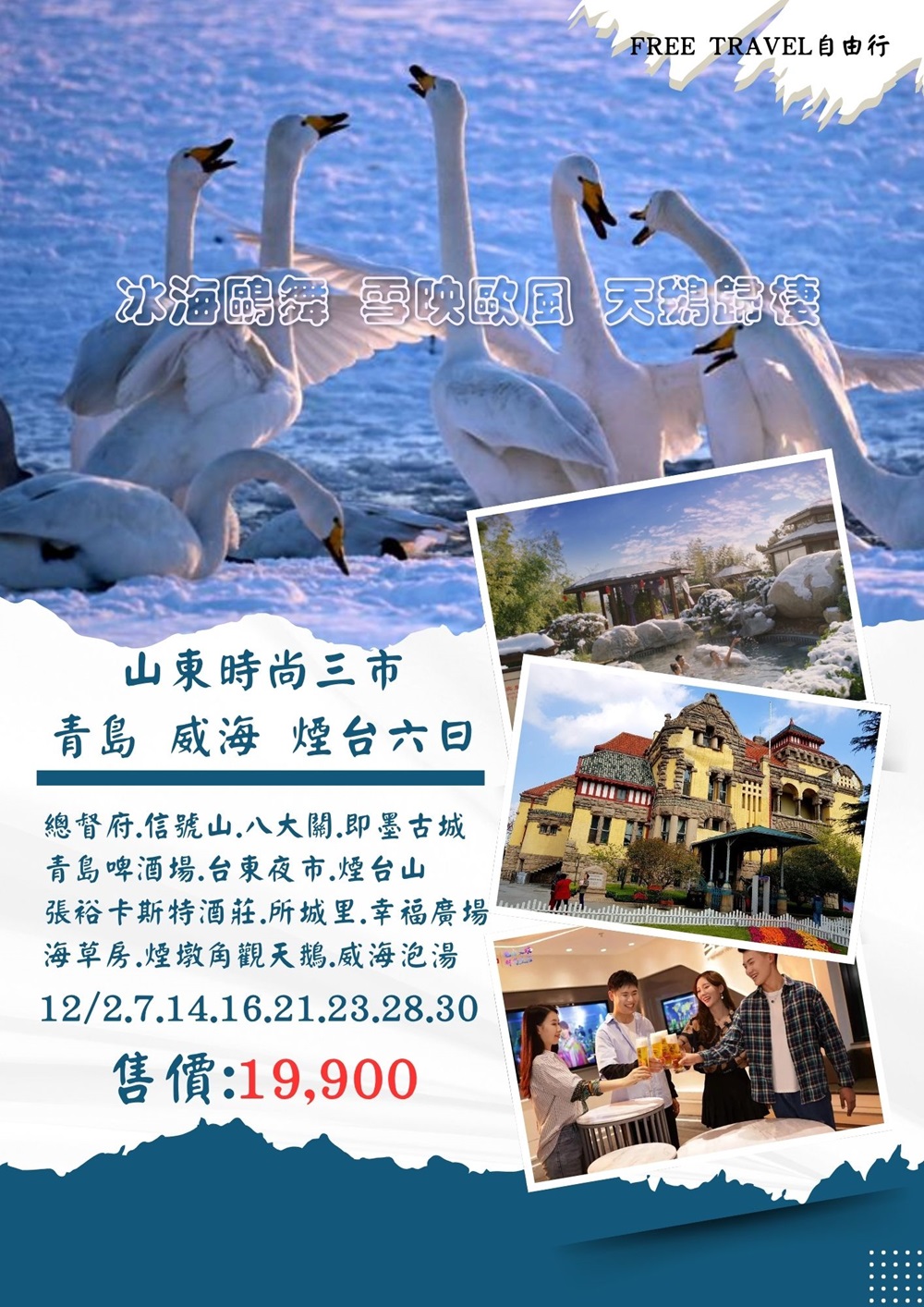 【山東航空】山東時尚三市-青島、威海、煙台6日~翩翩天鵝 津津美食 暖暖溫泉 好景連連